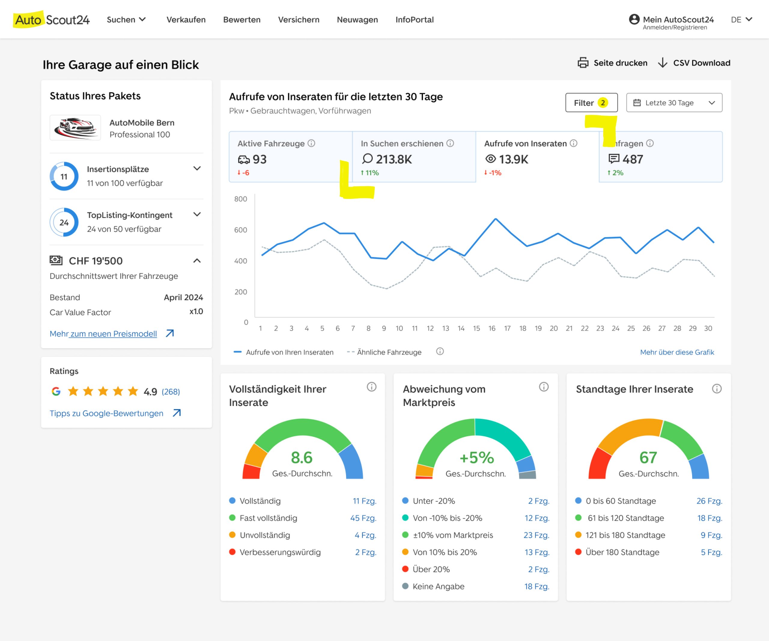 Wir führen Sie durch zwei der wichtigsten Seiten auf Autoscout24 und zeigen Ihnen, wie Sie ihre Performance auf diesen Seiten verfolgen können.
