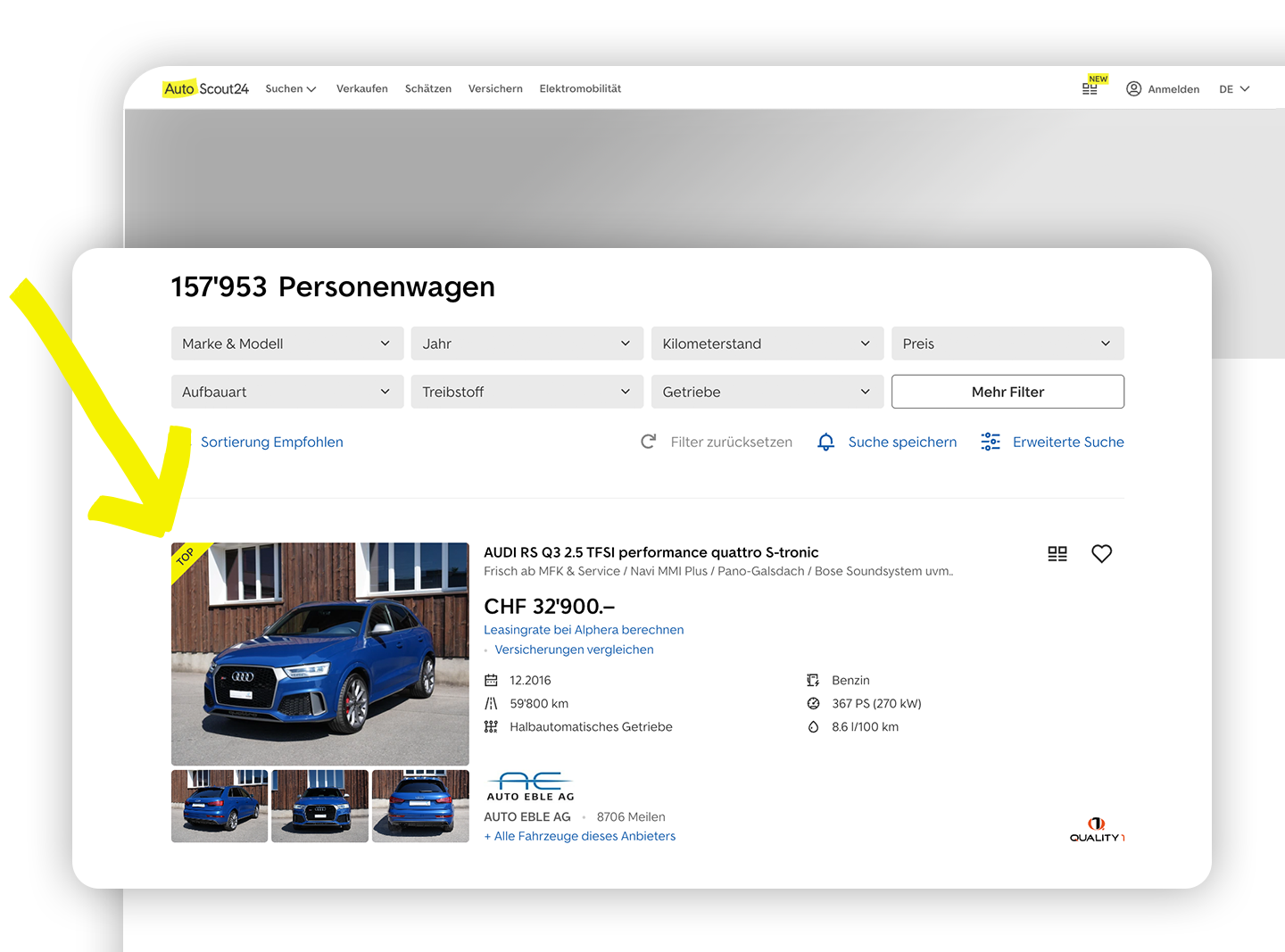 TopListings mit gelbem Label erscheinen prominent in den Suchergebnissen und werden bevorzugt gerankt. Das auffällige Design und die zeitlich begrenzte Priorisierung sorgen je nach Paket (Starter, Basic, Professional, ProfessionalPlus) für höhere Aufmerksamkeit.