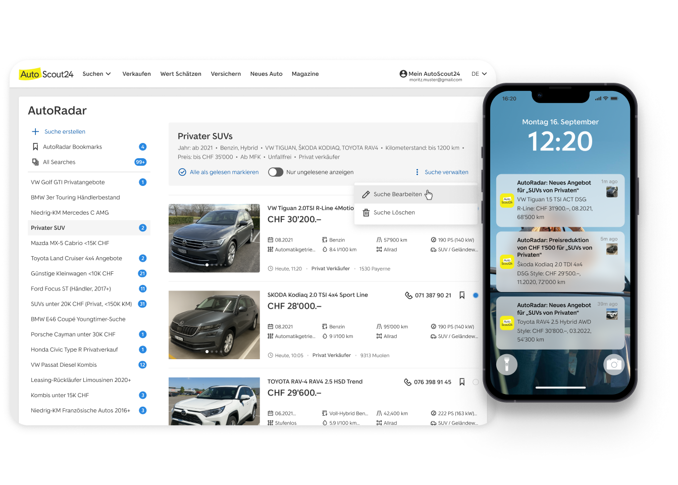 Wir haben Autoradar komplett überarbeitet, um es noch leistungsfähiger zu machen. Das Ergebnis: eine intuitivere, schnellere Version, direkt verbunden mit der AutoScout24 App.