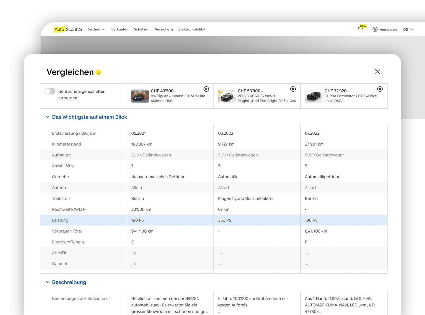- Bessere Entscheidungsgrundlage: Mit einem direkten Vergleich der Fahrzeuge entdecken Sie sofort die entscheidenden Unterschiede und Highlights. Ausserdem können identische Spezifikationen der zu vergleichenden Fahrzeuge ausgeblendet werden.